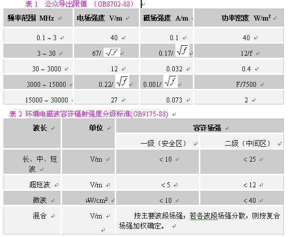 在對一般環(huán)境的電磁輻射分析中,應(yīng)主要選用《環(huán)境電磁波衛(wèi)生標(biāo)準(zhǔn)》主要選用《環(huán)境電磁波衛(wèi)生標(biāo)準(zhǔn)》(GB9175-88),根據(jù)輻射源的主要輻射頻率,參照表2,找到其輻射強(qiáng)度限值。注意掌握三個標(biāo)準(zhǔn)限值,一般我們把居民居住的環(huán)境按一級安全區(qū)處理,則其標(biāo)準(zhǔn)限值為:在長、中、短波,電場強(qiáng)度應(yīng)小于10V/m;在超短波段,電場強(qiáng)度應(yīng)小于5V/m;在微波波段,其輻射功率密度應(yīng)小于10μW/cm2?紤]到對在電磁輻射環(huán)境內(nèi)工作人員的保護(hù),我們建議在職業(yè)安全衛(wèi)生領(lǐng)域,采用《電磁輻射防護(hù)規(guī)定》(GB8702-88)的相應(yīng)限值。